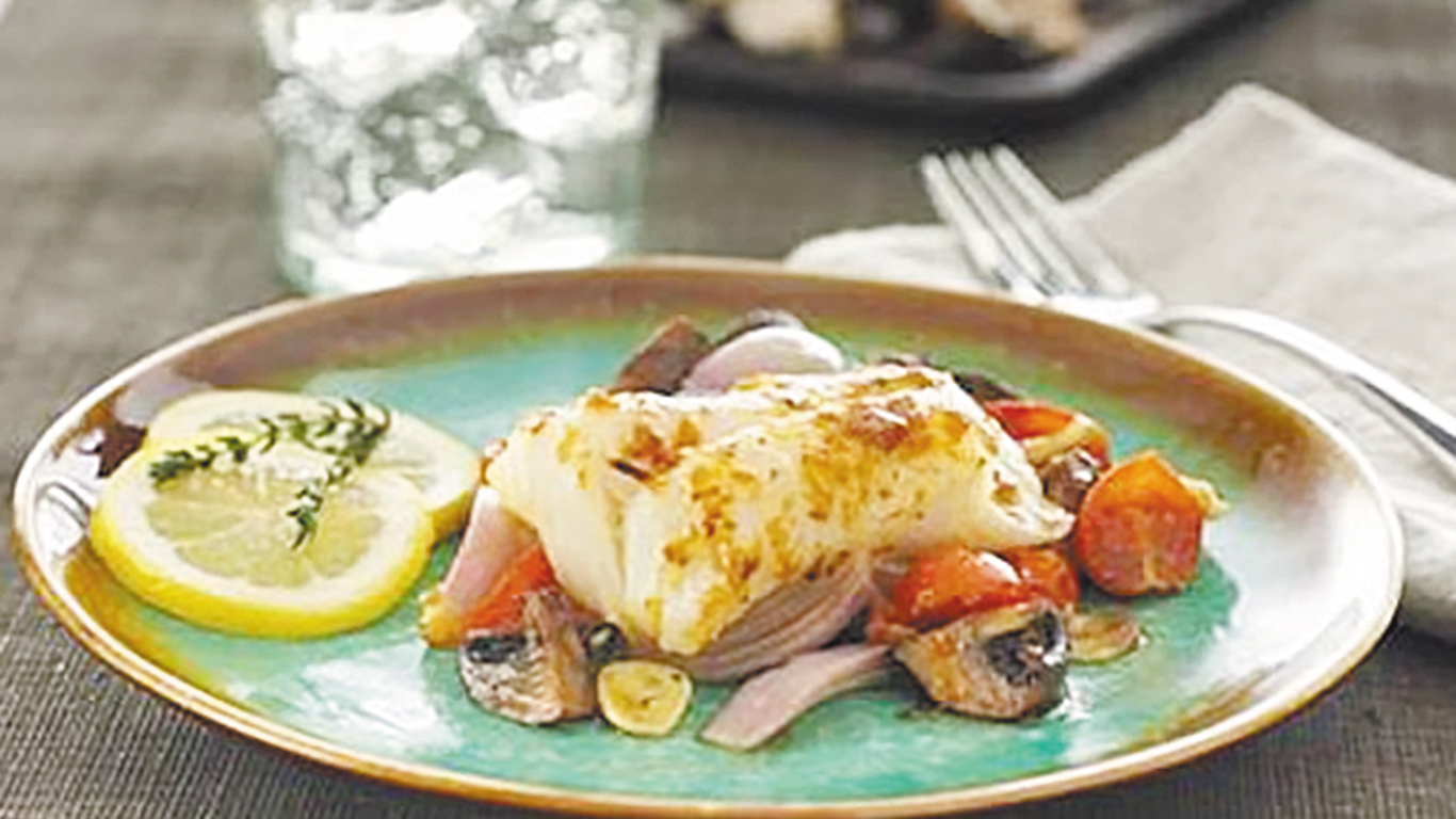 3. Retirer la rôtissoire du four et disposer la morue au centre, en déplaçant les légumes vers les côtés. Badigeonner le reste du mélange d’huile sur la morue et cuire jusqu’à ce que la morue s’effrite avec une fourchette, environ 15 minutes. Disposer la morue et les légumes rôtis dans un plat de service. Garnir de quartiers de citron.