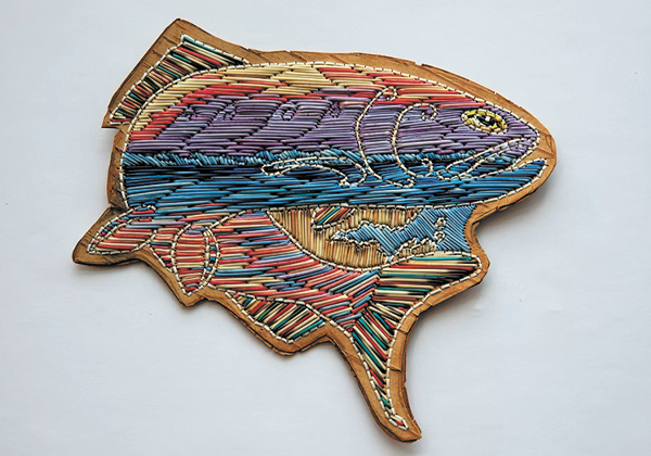 Oeuvre créée durant la résidence La Baie des Chaleurs, écorce de bouleau, aiguilles de porc-épic, 2025.