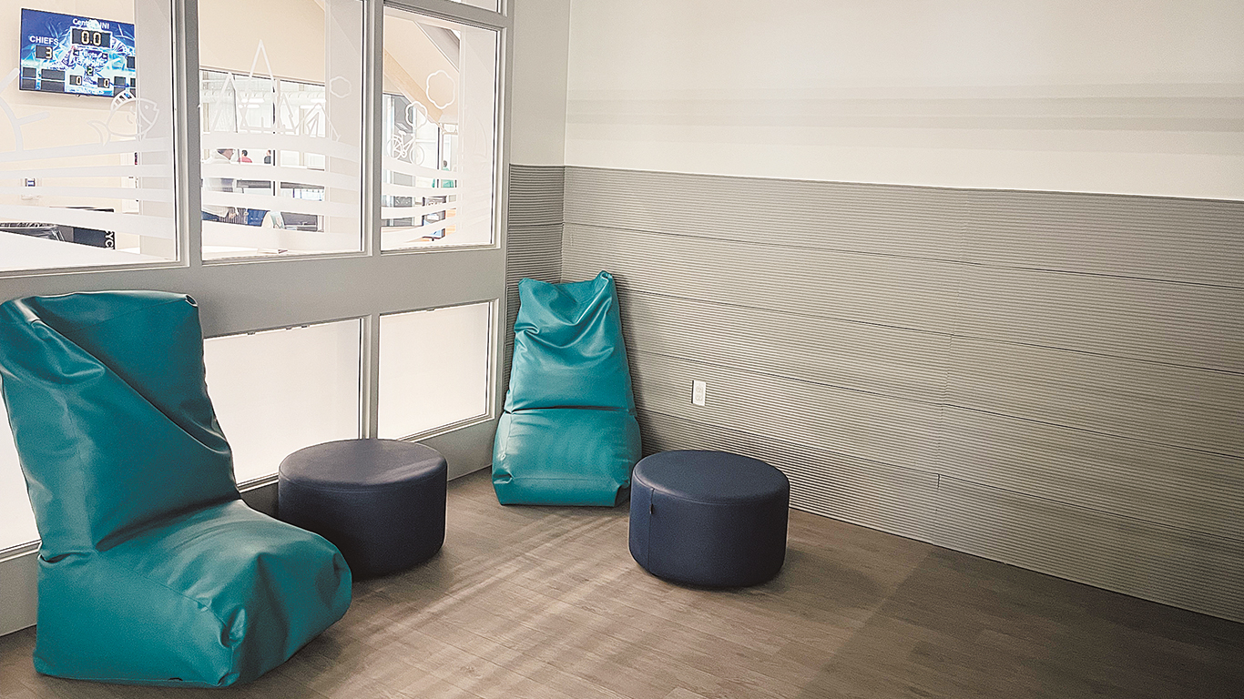 Lorsque le bruit, la lumière et autres deviennent trop oppressants, la personne peut se rendre à la salle calme pour prendre une pause. Le plafond est insonorisé et les murs sont à moitié couverts de panneaux spéciaux. Les couleurs des murs et du revêtement du plancher ont été choisies pour procurer un apaisement visuel. L’espace est doté de fenêtres pour que les parents puissent tenir un œil sur leur enfant, mais elles sont partiellement givrées pour réduire la luminosité.