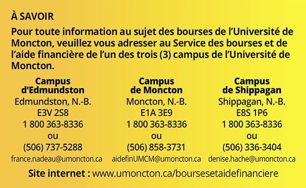 Critères : Excellence scolaire. Ces bourses sont remises aux candidates et candidats qui s’inscrivent pour la première fois à l’un des campus de l’Université de Moncton, dans un programme d’études de premier cycle. L’Université garantit une bourse pouvant atteindre une valeur de 12 000 $ à 15000 $ à l’étudiante ou l’étudiant qui a maintenu une moyenne d’au moins 80 % selon les modalités suivantes : si une demande d’admission est faite au plus tard le 15 décembre, l’offre de bourse sera calculée à partir des notes de la 11e année seulement. Cette offre sera honorée, peu importe les notes obtenues lors de la première session de la 12e année. Dans le cas d’une augmentation de la moyenne après la première session de la 12e année, la candidate ou le candidat aura droit à une majoration de la bourse. Si la demande d’admission est faite après le 16 décembre, mais avant l’obtention du diplôme de fin d’études secondaires, le calcul est fait avec les notes de la 11e année et la première session de la 12e année. Si la demande d’admission est faite après l’obtention du diplôme de fin d’études secondaires, le calcul est fait avec les notes de tous les cours suivis en 11e et 12e années. Dans tous les cas, le relevé de notes doit accompagner la demande d’admission. Pour les étudiant.e.s qui ont fait des études universitaires ou collégiales, les notes des deux dernières années d’études seront considérées pour le calcul de la moyenne.