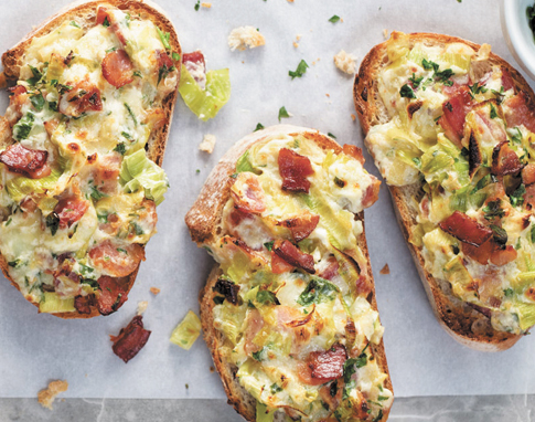 Tartines au bacon, aux poireaux et au fromage