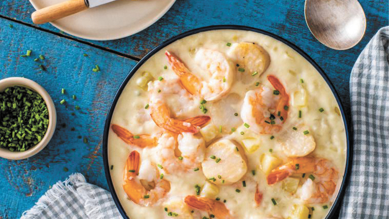 Crevettes, pétoncles, palourdes et pommes de terre sont à l’honneur dans ce bouillon crémeux absolument divin.