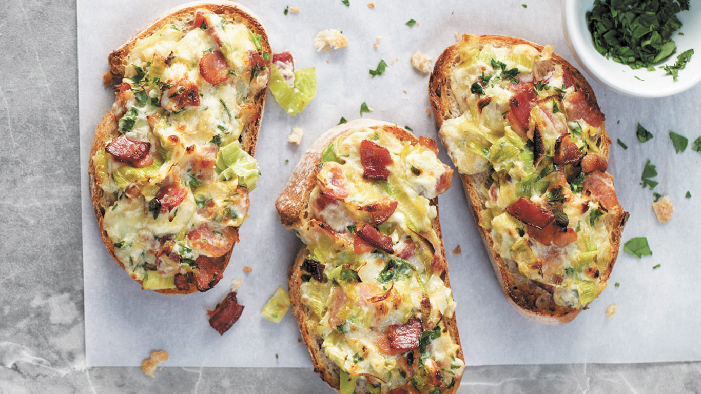 Tartines au bacon, aux poireaux et au fromage